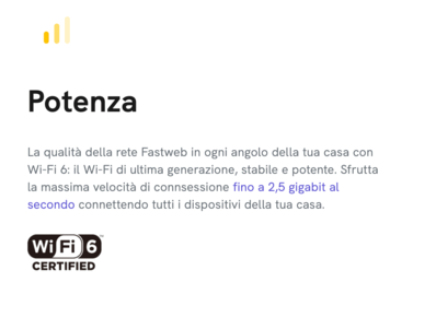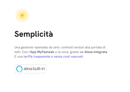 In ogni caso, ad entrambe vanno inserite le note legali :Fibra Ultraveloce fino a 2,5 Gigabit/s disponibile in aree coperte da Fibra Fastweb FTTH NGN GPON. Sfrutta al massimo la connessione fino a 2,5 Gigabit/s connettendo tutti i dispositivi della tua casa. L’Offerta può essere soggetta a limiti tecnologici di velocità e/o di copertura geografica, verifica la tua copertura, le caratteristiche tecnologiche, le performance raggiungibili ed i servizi fruibili al tuo indirizzo in store. Offerta Fastweb NeXXt Casa Light valida fino al 22/08/2021, con pagamento tramite carta di credito o addebito su conto corrente. Fastweb NeXXt Casa Light include il Fastweb NeXXt e prevede chiamate a consumo. Info sui costi a consumo delle chiamate nazionali internazionali su gofw.it/infoutili. Incluso nell’offerta hai 3 mesi di discovery+ che ti consente di accedere ai contenuti del pacchetto conosciuto come discovery+. I 3 mesi decorrono dall’attivazione del servizio discovery+ che può essere richiesta entro e non oltre il 31 Gennaio 2022. Per attivare discovery+ è necessario accedere alla tua Area Clienti MyFastweb e/o su FastwebUP con le credenziali che ti forniremo dopo la sottoscrizione del contratto Fastweb. Resta inteso che i Servizi di Discovery vengono erogati da Dplay Entertainment Limited in modo autonomo ed indipendente sulla base di un contratto distinto da quello stipulato con Fastweb. PROVA 30 GIORNI: nessun vincolo e costo se disdici tramite l’Area Clienti MyFastweb, al link gofw.it/freedom, entro 30 giorni dall’attivazione del servizio. Puoi disdire senza mantenere il tuo numero o passarlo ad altro operatore, in entrambi i casi Fastweb procederà al rimborso dell’importo della prima fattura emessa per l’Offerta Fastweb NeXXt Casa Light. La richiesta di disattivazione sarà gestita entro le tempistiche contrattualmente previste. Decorso il termine di 30 giorni dall’attivazione, Fastweb non potrà procedere al rimborso ed una eventuale richiesta di disattivazione dovrà essere inviata tramite i canali consueti messi a disposizione da Fastweb con addebito del costo di dismissione. L’importo per la dismissione del servizio che sarà addebitato è pari all’importo mensile non promozionato dell'offerta Fastweb. Il costo di disattivazione può variare di anno in anno. Per conoscere i costi aggiornati vai su gofw.it/trasparenza. Nell’importo mensile dell’offerta Fastweb NeXXt Casa Light è incluso il contributo di attivazione del servizio, pari a 1€ per 24 mesi. In caso di recesso anticipato prima dei 24 mesi non verrà addebitato alcun importo relativo alle rate mancanti. Fastweb Nexxt è fornito in comodato d’uso gratuito. In caso di cessazione del Contratto dovrai restituirli entrambi con le modalità che ti indicheremo. Ti ricordiamo che la mancata restituzione degli apparati comporterà l’addebito di una penale. Info su restituzione modem, configurazione di modem alternativi e copertura rete in Fibra su gofw.it/trasparenza. L’utilizzo della funzionalità Alexa richiede la sottoscrizione di un contratto con Amazon, che è autonomo e indipendente dal Contratto stipulato con Fastweb. Tutti i prezzi sono IVA inclusa.
